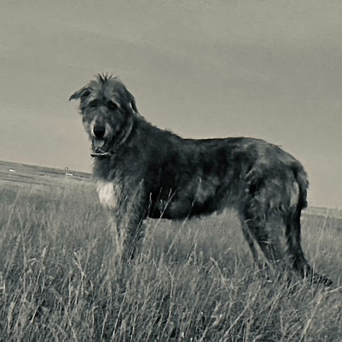 Cara has a full AKC registration and is the perfect Irish Wolfhound. She is an incredibly gentle and sweet giant. Her favorite activities are going for walks and counter-surfing, after which she is quick to look for absolution! Cara lovingly allows my massage clients to finish their therapy with a bit of love from her. She also loves to chill on the couch, bed, floor, grass, or any other handy place, but ask if she wants to go for a ride or walk, and she is off and running, ready for whatever adventure you propose. She loves exploring new places, but she is not all that brave alone. However, if she has her old and wise friend, Fancy, by her side, she can take on the world.
